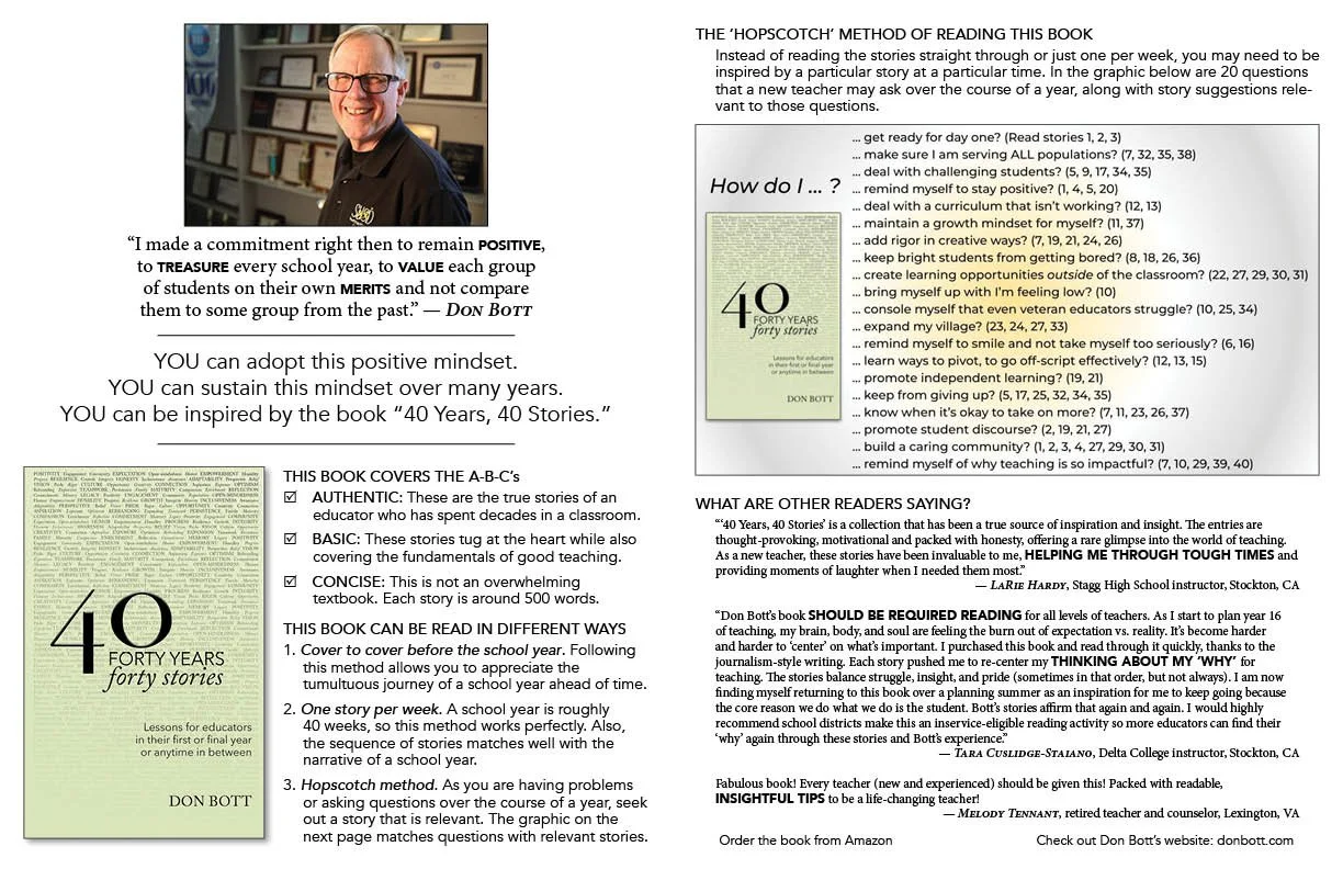 Don Bott been a high school educator since 1985. He has taught every imaginable English class, from intervention to honors/Advanced Placement. He also advised various campus publications, including the nationally award-winning Stagg Line newspaper for 27 years. in 2002 he was named National Journalism Teacher of the Year. He has presented to many audiences, large and small, for more than three decades. In recent years he has worked as an instructional coach, where his goal has been to help young teachers find their purpose and passion. His book, “40 Years, 40 Stories,” taps into his many experiences in education. Through the 40 short pieces, he illustrates the value of being positive, open-minded and oriented toward a growth mindset. Over the years Don has spoken to many audiences — students and teachers and teachers in training — on a wide variety of topics. He is eager to speak to any group of educators with the hope of lighting a fire.